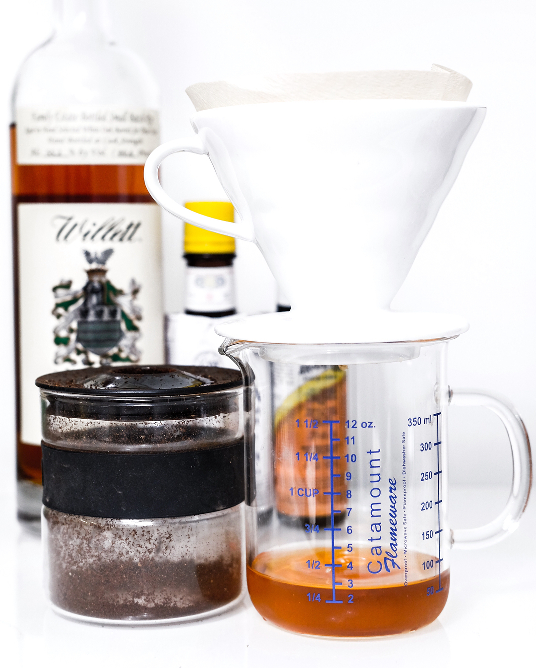 Coffee has quite the strong flavor, which makes it a perfect candidate for quick infusions. I used about half the amount I’d use for a cup of drip brew, and probably could have made do with half of that. Alcohol is much better at extracting flavors than water, so think of this as an extreme and quick cold brew. I went with a classic Old Fashioned for my drip brew cocktail and really loved the result.